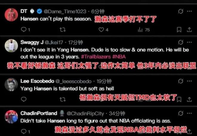 杨瀚森在NBA季前赛首秀中只得到了4分4个篮板1次助攻,而且出现了4次失误和6次犯规,表现有些糟糕。从比赛的情况来看,杨瀚森暴露出了很多问题,比如对抗太差、速度太慢、护框卡位问题明显、体能跟不上等等。对于杨瀚森的表现,不少国内球迷和美国球迷都有些失望。国内媒体和球迷还好说,只是希望杨瀚森能够认识到自己的不足,在接下来的训练中提升自己。但美国球迷对杨瀚森的评价就没有这么委婉了,直言杨瀚森又软又慢,甚至表示他会在三年内淡出NBA。